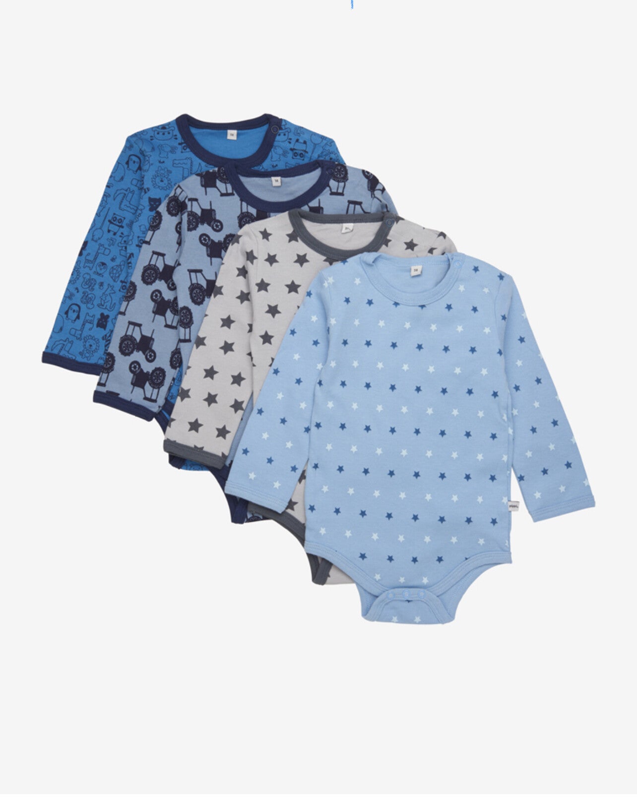 4-pakning med bodystockings med forskjellige trykk. Myke ribbekanter rundt hals, ermer og ben. Praktiske trykknapper på den ene skulderen og mellom bena. Sertifisert i henhold til OEKO-TEX® STANDARD 100. Sertifiseringsnr. 2276-364 DTI.