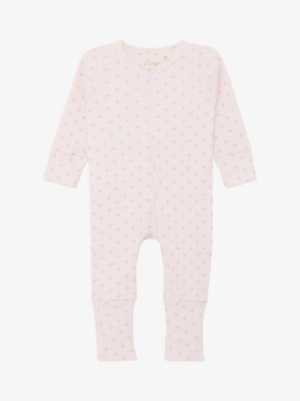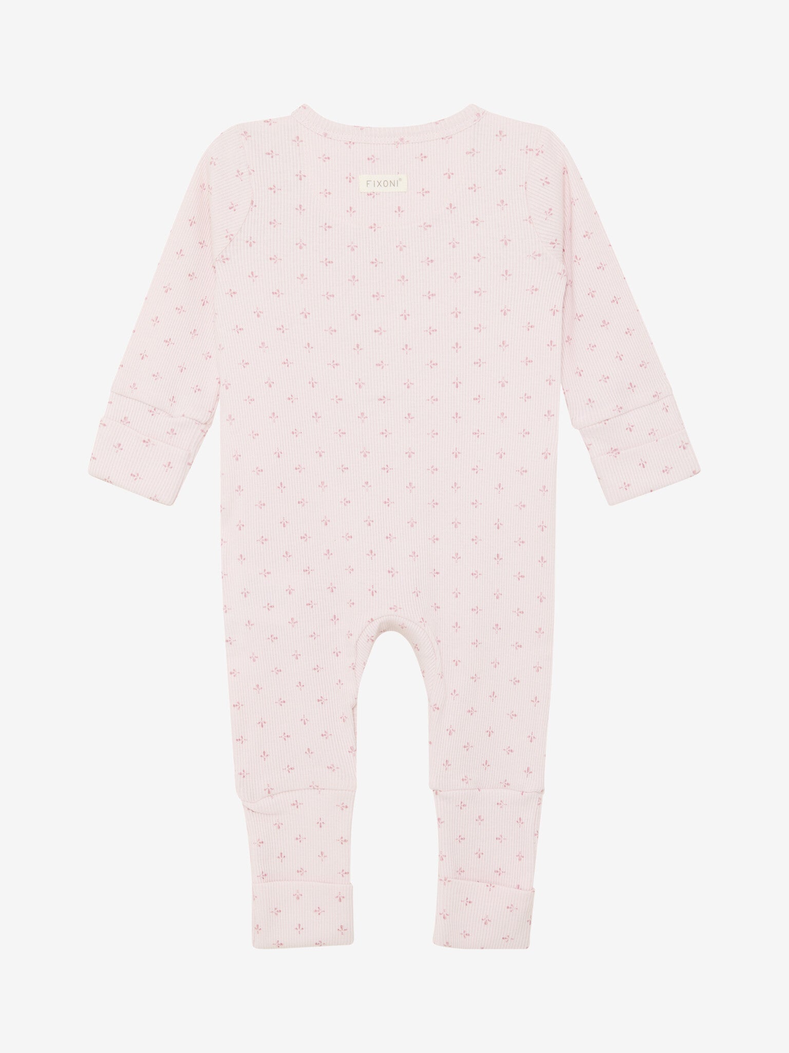 Delikat, heltrykt FIXONI-drakt, laget av fin ribbekvalitet. Draktens ermer og ben kan brettes rundt. Lukkes enkelt med trykknapper foran. Sertifisert i henhold til GOTS - organisk CERES-0366