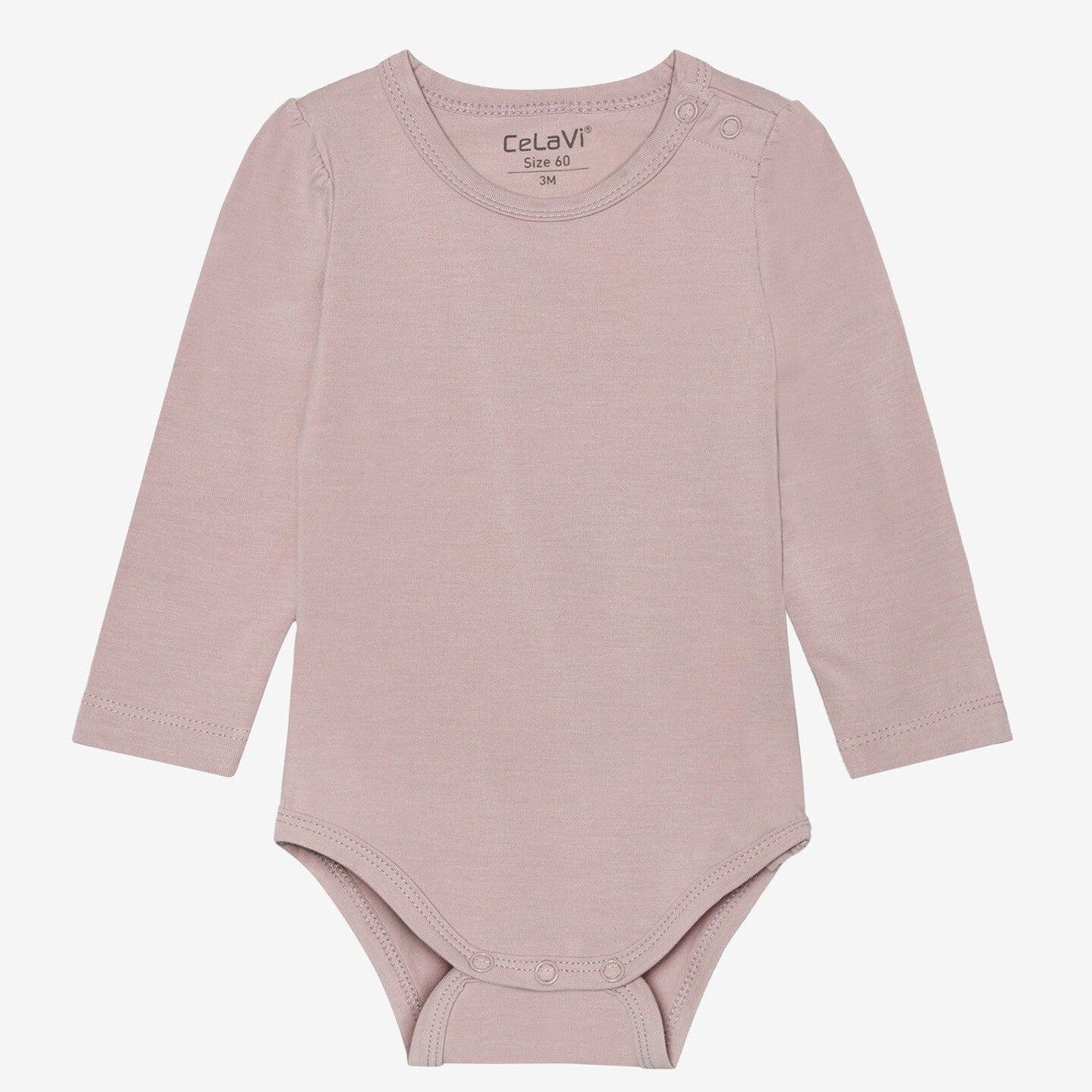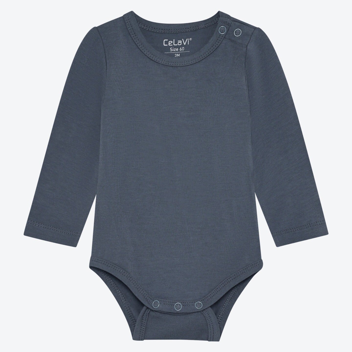 Ensfarget langermet body fra CeLaVi. Bodyen er laget av et elastisk materiale. Den festes med trykknapper på den ene skulderen og mellom bena. Sertifisert i henhold til OEKO-TEX® STANDARD 100 Cert. No. 2276-364 DTI