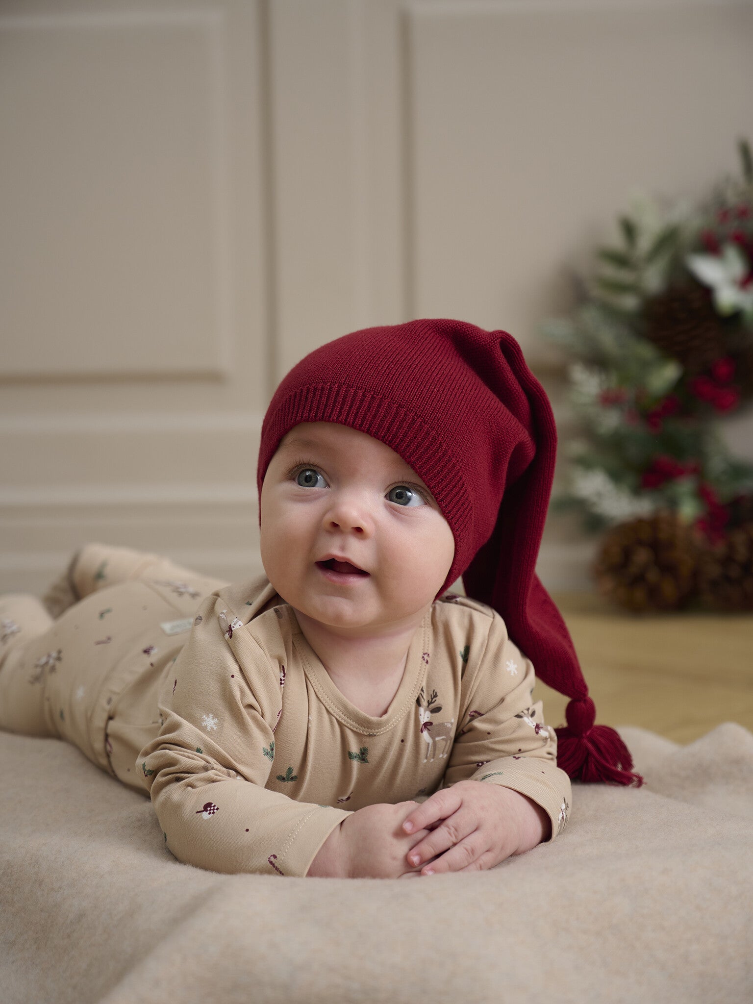Ensfarget strikket nisselue fra FIXONI. Hatten er en spiss lue med en dusk på. Sertifisert i henhold til GOTS - økologisk CERES-0366