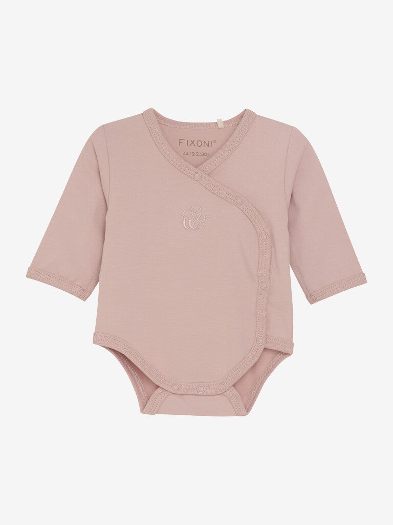Warp-around kropp fra FIXONI med lange ermer. Kroppen lukkes med knapper mellom bena og på siden. Ribbing i alle ender. Størrelse 32-44 har hull for sykehusslanger. Sertifisert i henhold til OEKO-TEX® STANDARD 100 Cert. Nr. 2276-364 DTI.
