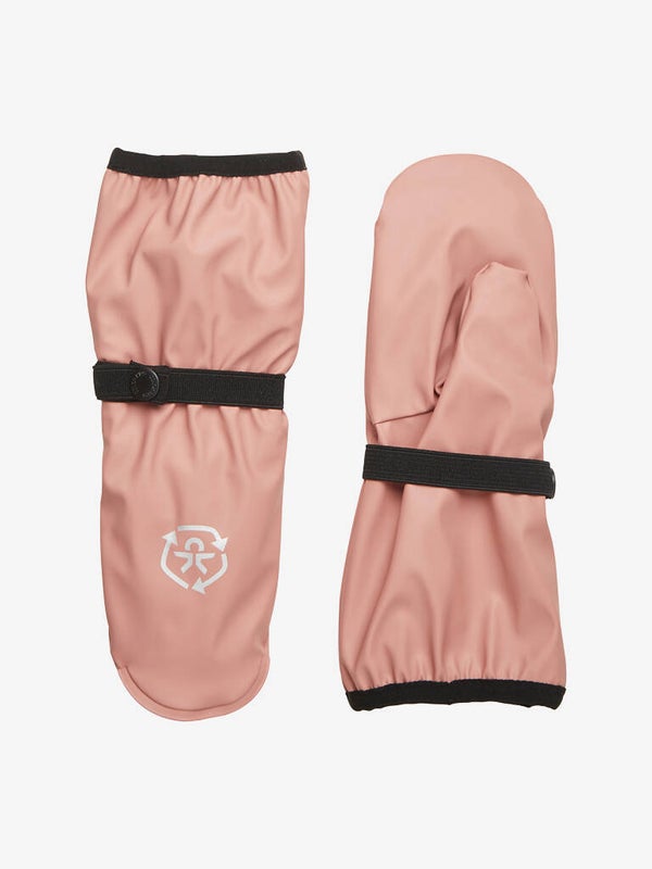 Enkle votter i resirkulert materiale. Vottene har et vanntrykkstrykk på 10 000 mm og sveisede sømmer som gjør dem viklet og vanntette. Vottene er lange og lukkes rundt håndleddet med en stropp med trykknapp. Farge Kids-logo på baksiden av hånden.