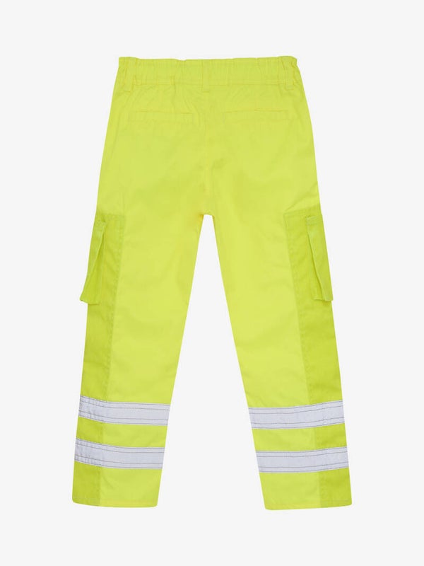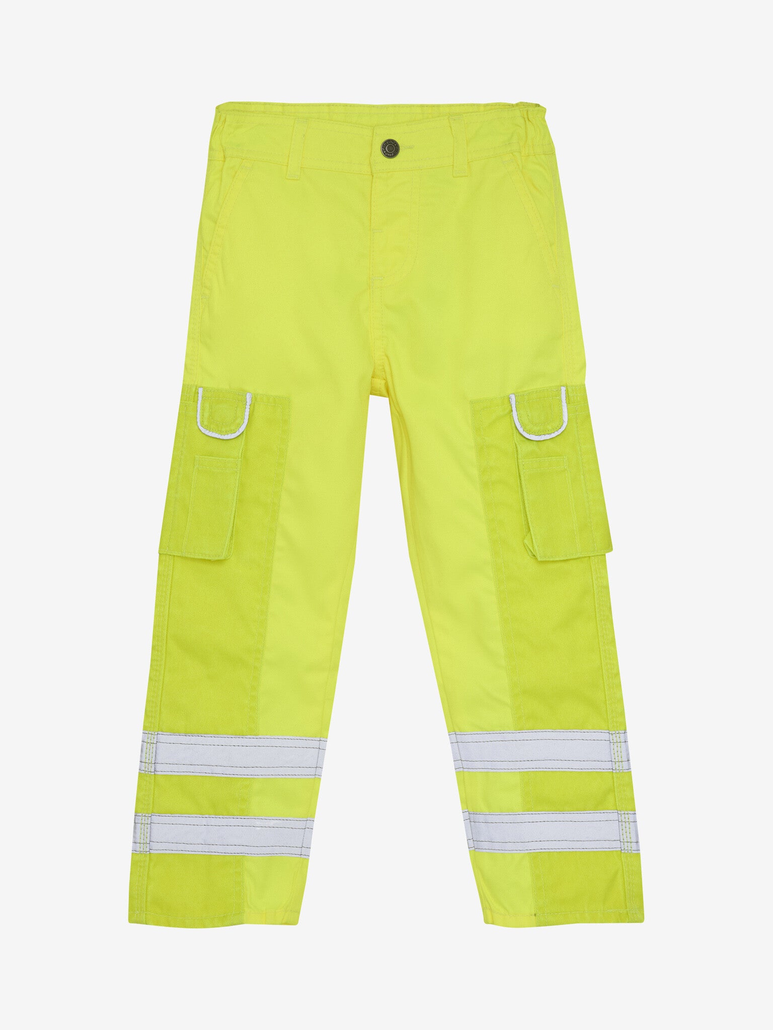 Kule arbeidsbukser fra Minymo. Buksene er laget av twill-stoff med kule neonlys. Buksene har elastisk og justerbar linning med plass til et belte for å sikre god passform. Buksene har lommer både foran og på siden, og falske lommer bak. Reflekterende striper på buksebeinet sørger for at barnet kan sees i mørket