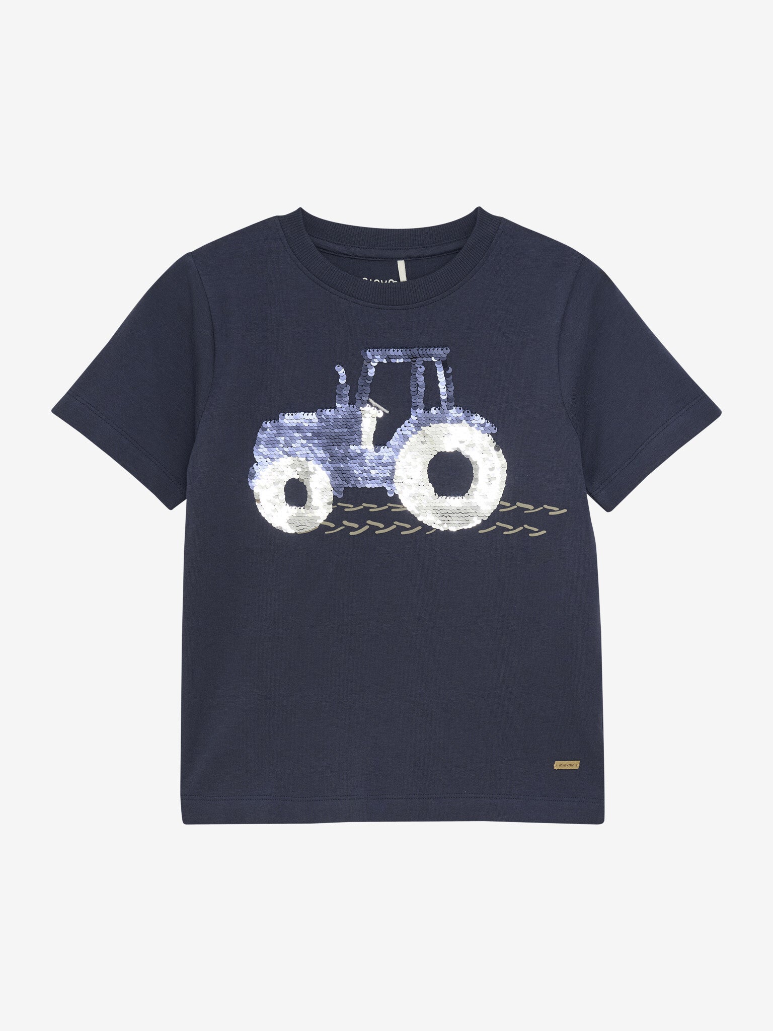 Kul kortermet t-skjorte med motiv i vendbare paljetter fra Minymo. T-skjorten er laget av en komfortabel bomullsblanding, og har et kult, revirsibelt bondemotiv i paljetter foran.