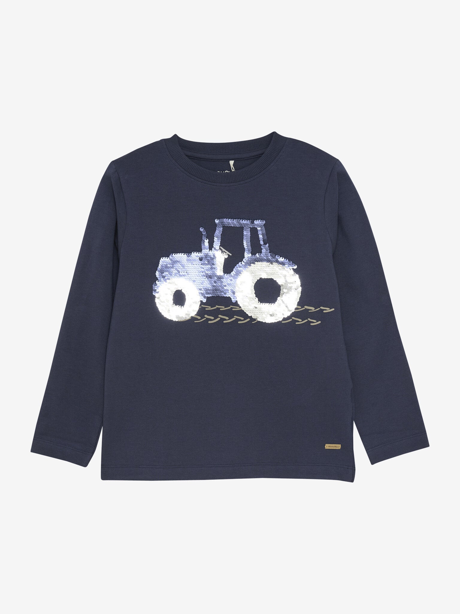Kul langermet Genser med motiv i vendbare paljetter fra Minymo. Genseren er laget av en komfortabel bomullsblanding, og har et kult, revirsibelt bondemotiv i paljetter foran.