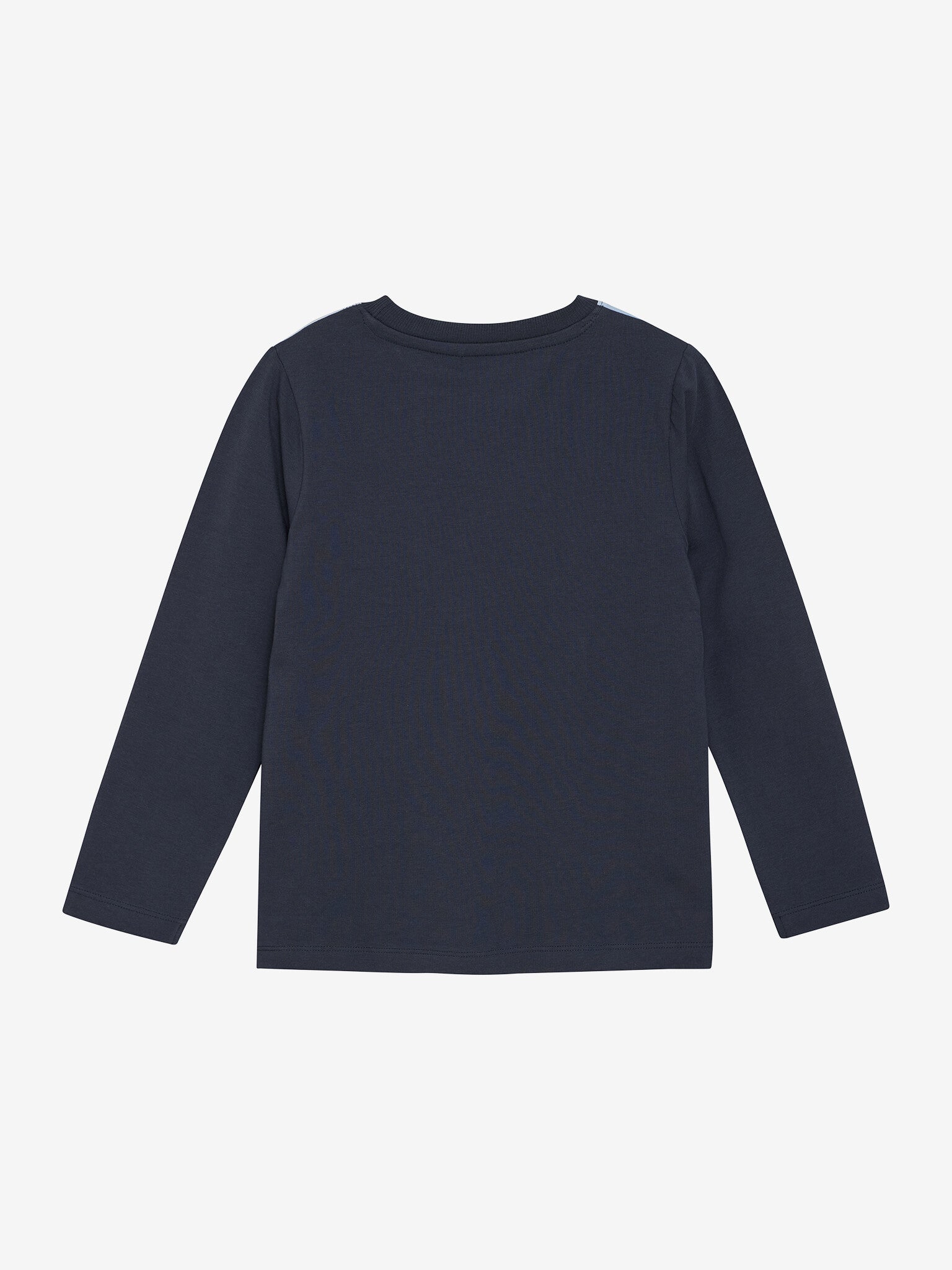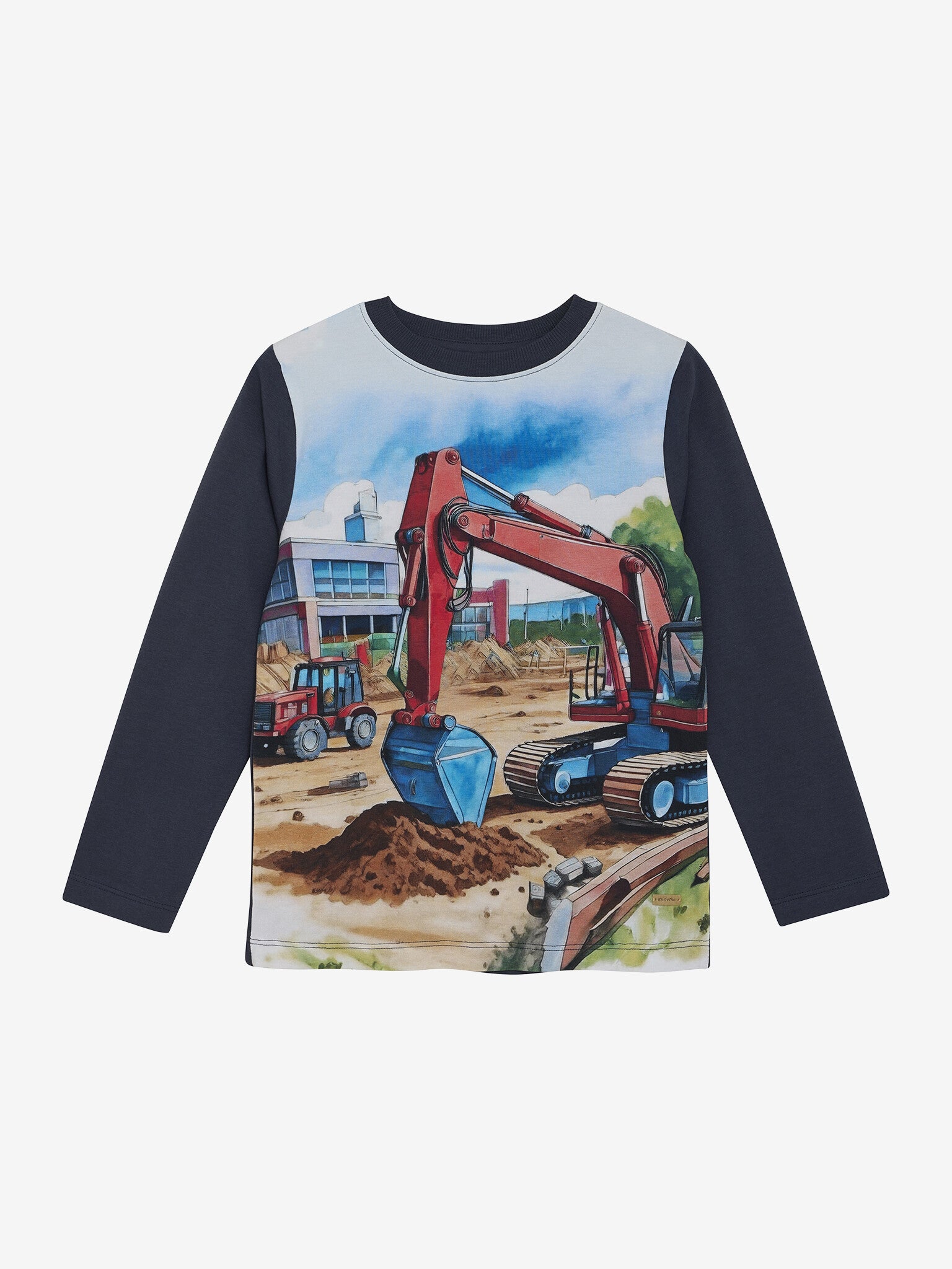 Kul langermet t-skjorte med trykk fra Minymo. T-skjorten er laget av en komfortabel bomullsblanding, og har et kult byggeplasstrykk foran. I størrelsene 86 og 92 er t-skjorten lukket med skjulte knapper på skulderen.