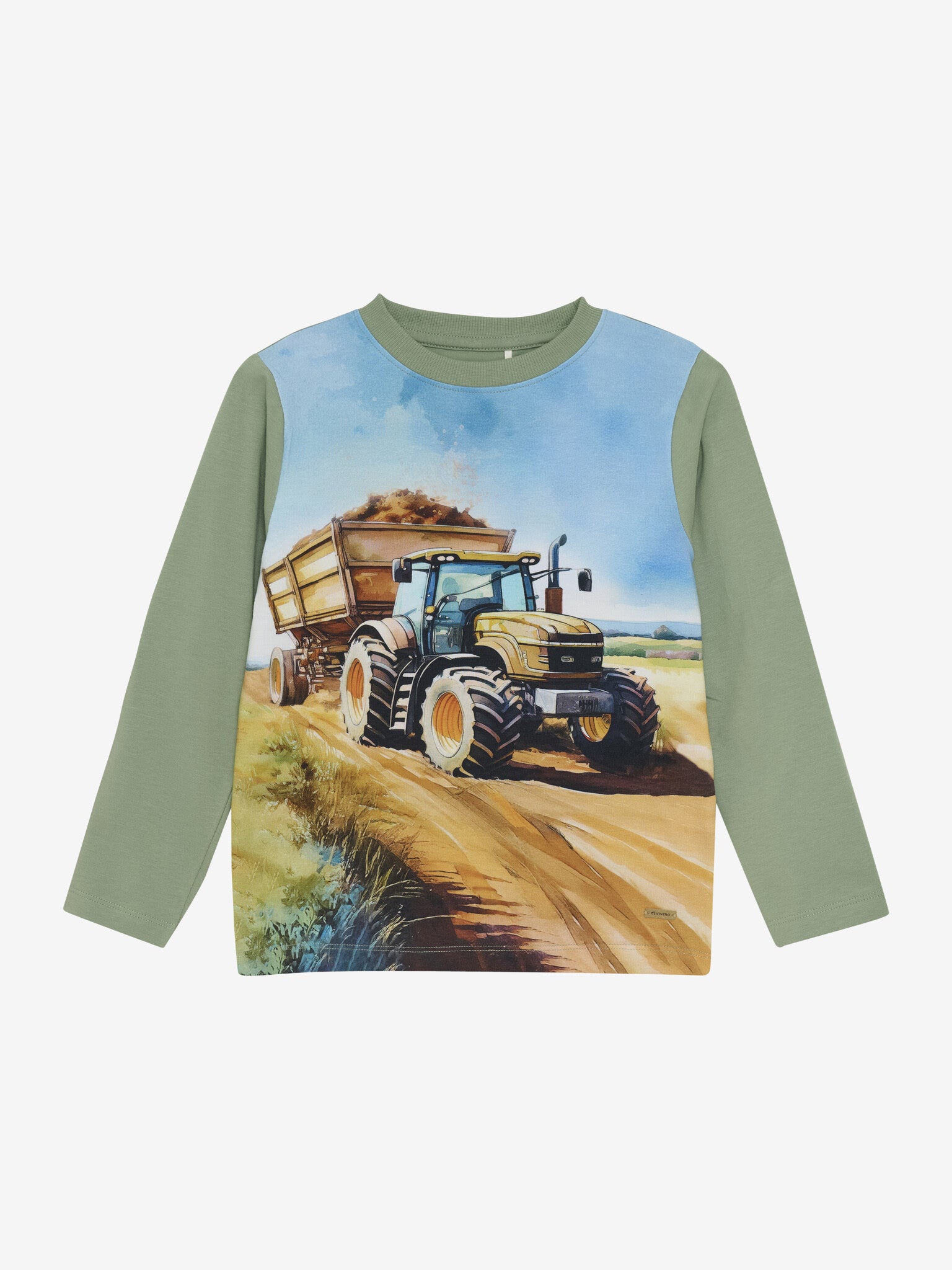 Kul langermet t-skjorte med trykk fra Minymo. T-skjorten er laget av en behagelig bomullsblanding, og har et kult bondemønster foran. I størrelsene 86 og 92 er t-skjorten lukket med skjulte knapper på skulderen.