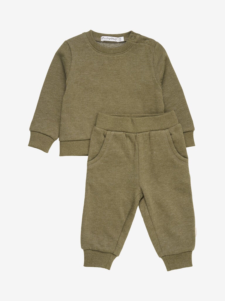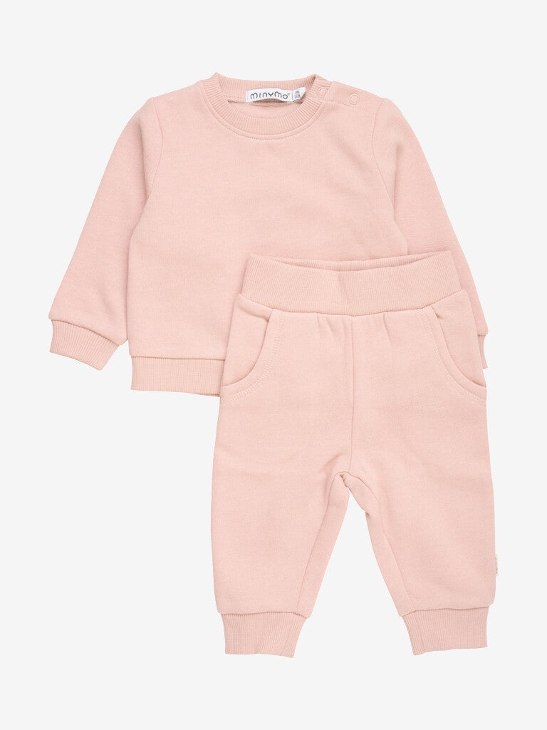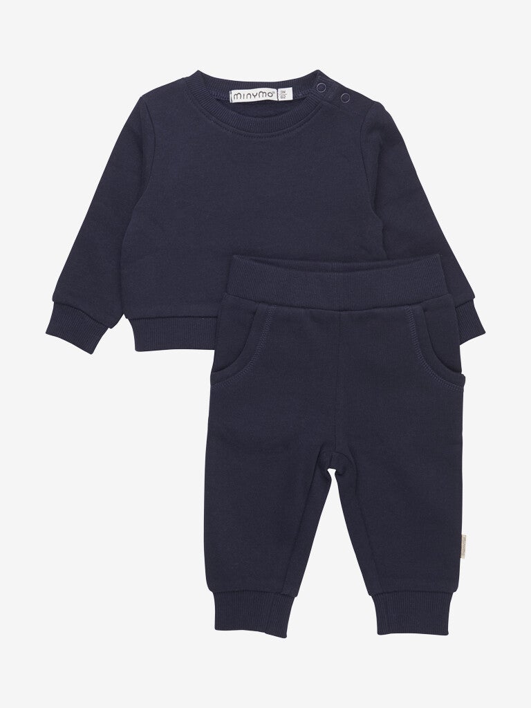 Mykt sett i en 2-pakning for de minste. Setet består av en genser med ribbestrik ved halsutringning, kant og håndledd. Den har trykknapper på skulderen. Buksene har ribbestrikking ved anklene og midjen, samt frontlommer. Pakken inkluderer to ensfargede sett.