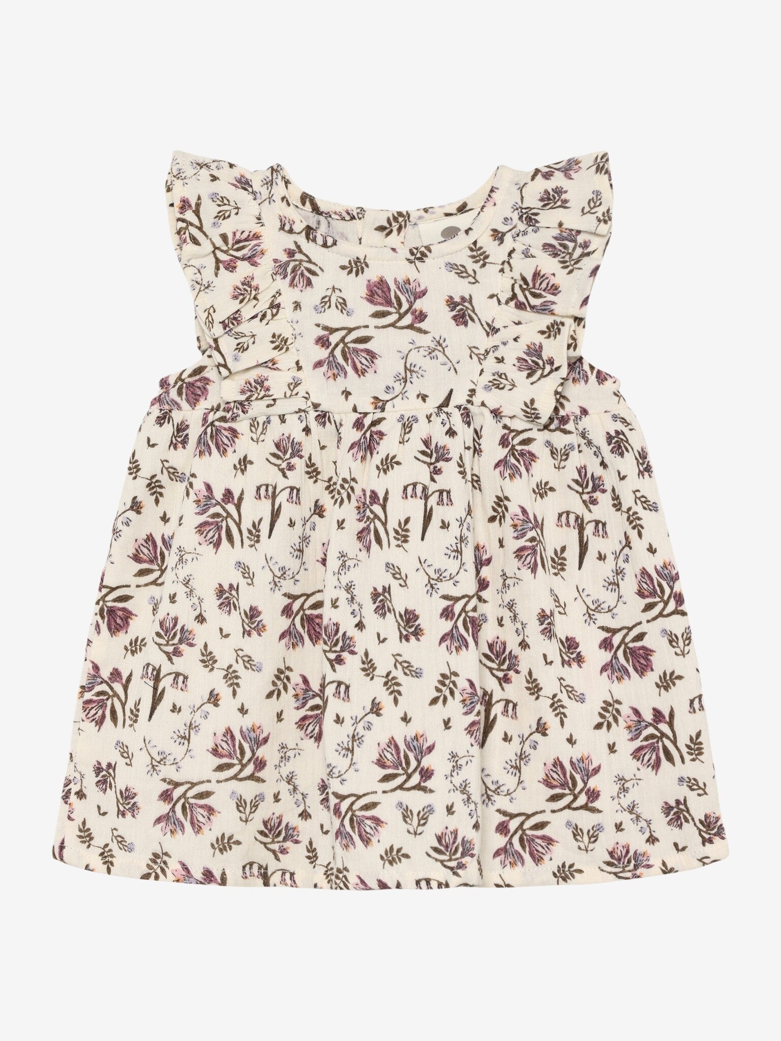 Kle deg fra EN FANT. Denne kjolen er laget i muslin-kvalitet med heltrykk. Kjolen har volanger som går fra brystet til baksiden. Den har et skjørt med rynker i livet og kan åpnes på baksiden av kjolen.