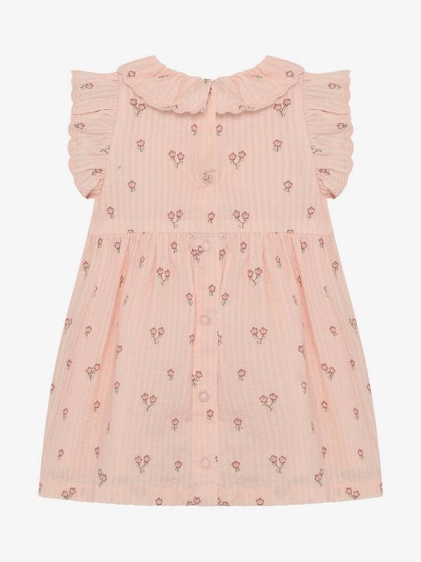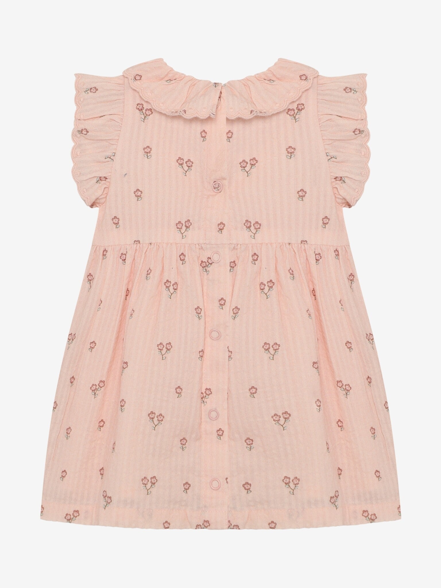 Ermeløs kjole fra Minymo. Kjolen har et heldekkende mønster. Den har volanger ved kragen og på skuldrene. Kjolen er laget av 100 % bomull.