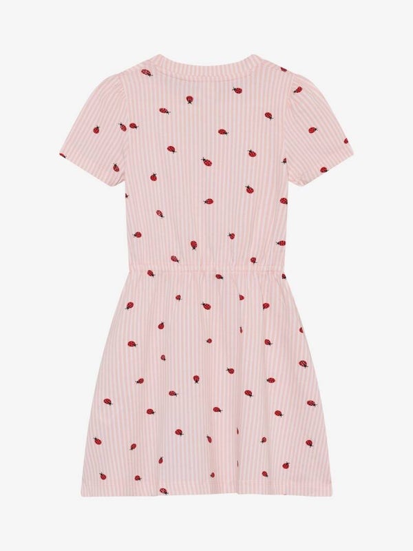 Kortermet kjole fra Minymo. Kjolen har et heldekkende mønster. Ermene har en svak puff-effekt. Den er laget av en bomullsblanding.