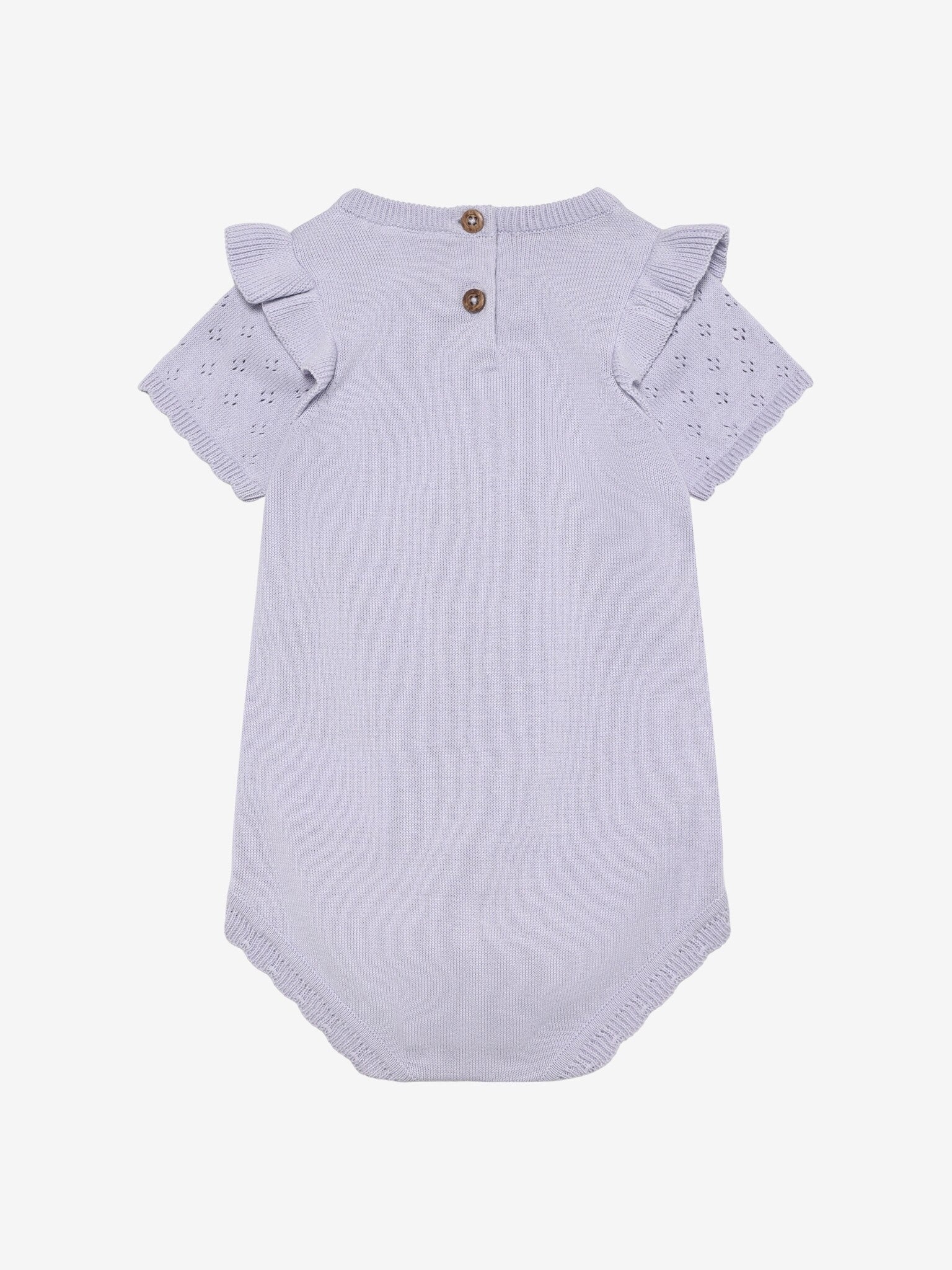 Strikket Body fra EN FANT. Har flounce ved skuldrene, en scalop-kant som avslutter erme- og benåpningen. Det er et snitt under brystet med samlinger. Denne Bodyen kan åpnes ved halsen og mellom beina. Sertifisert i henhold til GOTS - økologisk