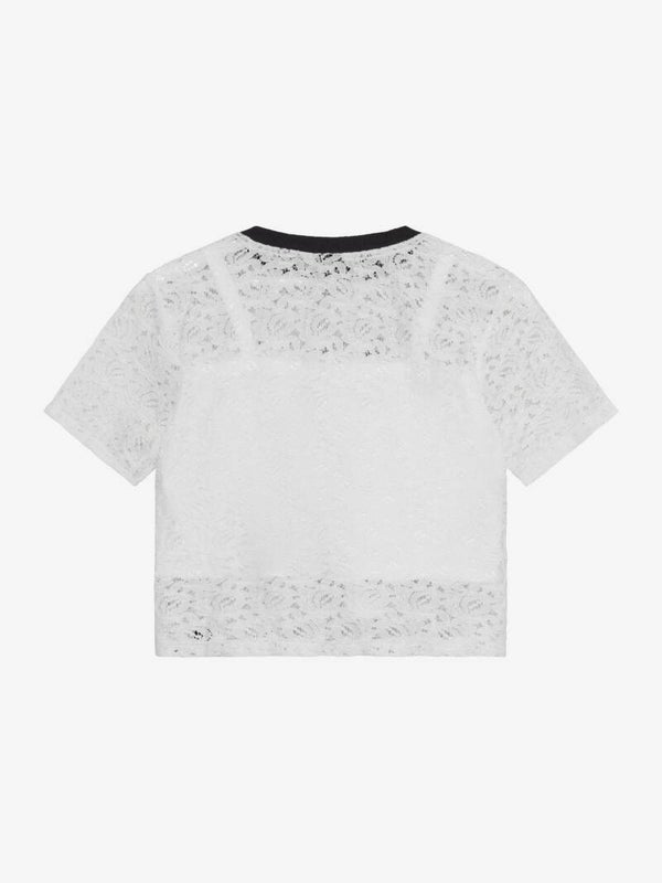 Kort T-skjorte fra Indian Blue Jeans. T-skjorten er laget av blonder og har et trykk foran. Den har også en V-hals i en kontrastfarge.