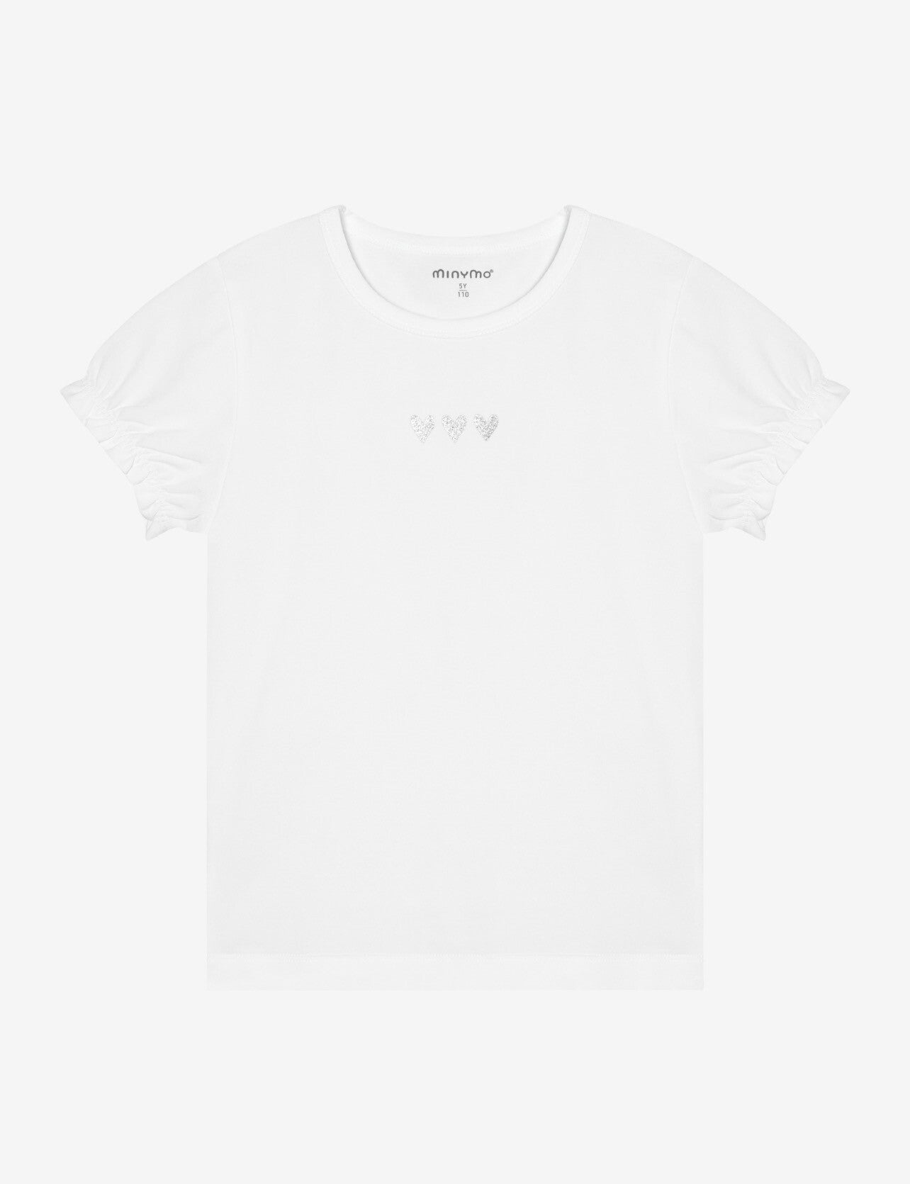 T-skjorte fra Minymo. T-skjorten er ensfarget med et trykk foran. Skuldrene har en puffeeffekt og strikk i kanten, noe som skaper en rysjekant på ermet.
