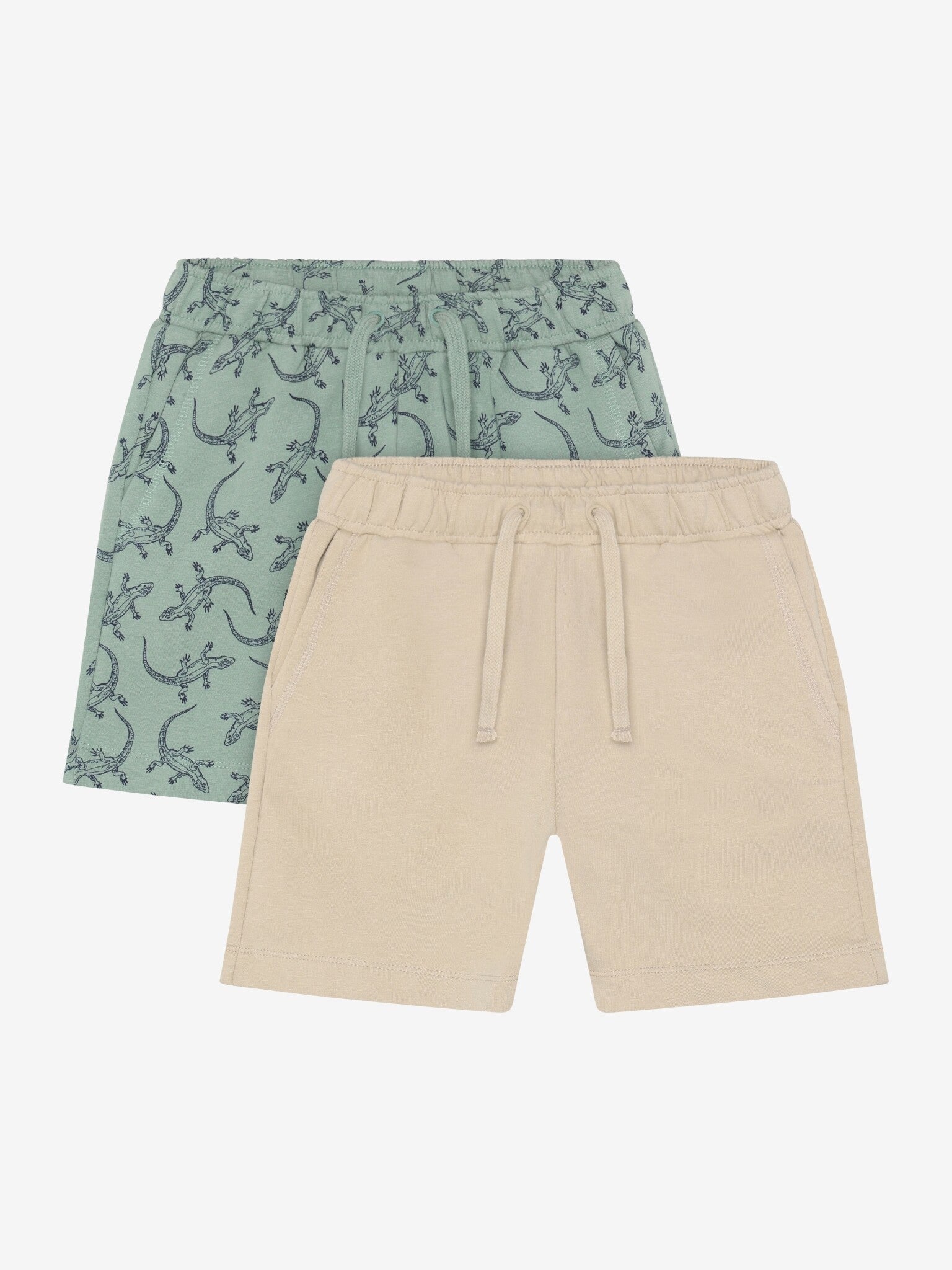 2-paknings shorts fra Minymo. Sekken inneholder to par shorts: ett ensfarget og ett med mønster. Begge parene har elastisk linning med justerbar trekksnor og lommer. Laget med sertifisert økologisk bomull.