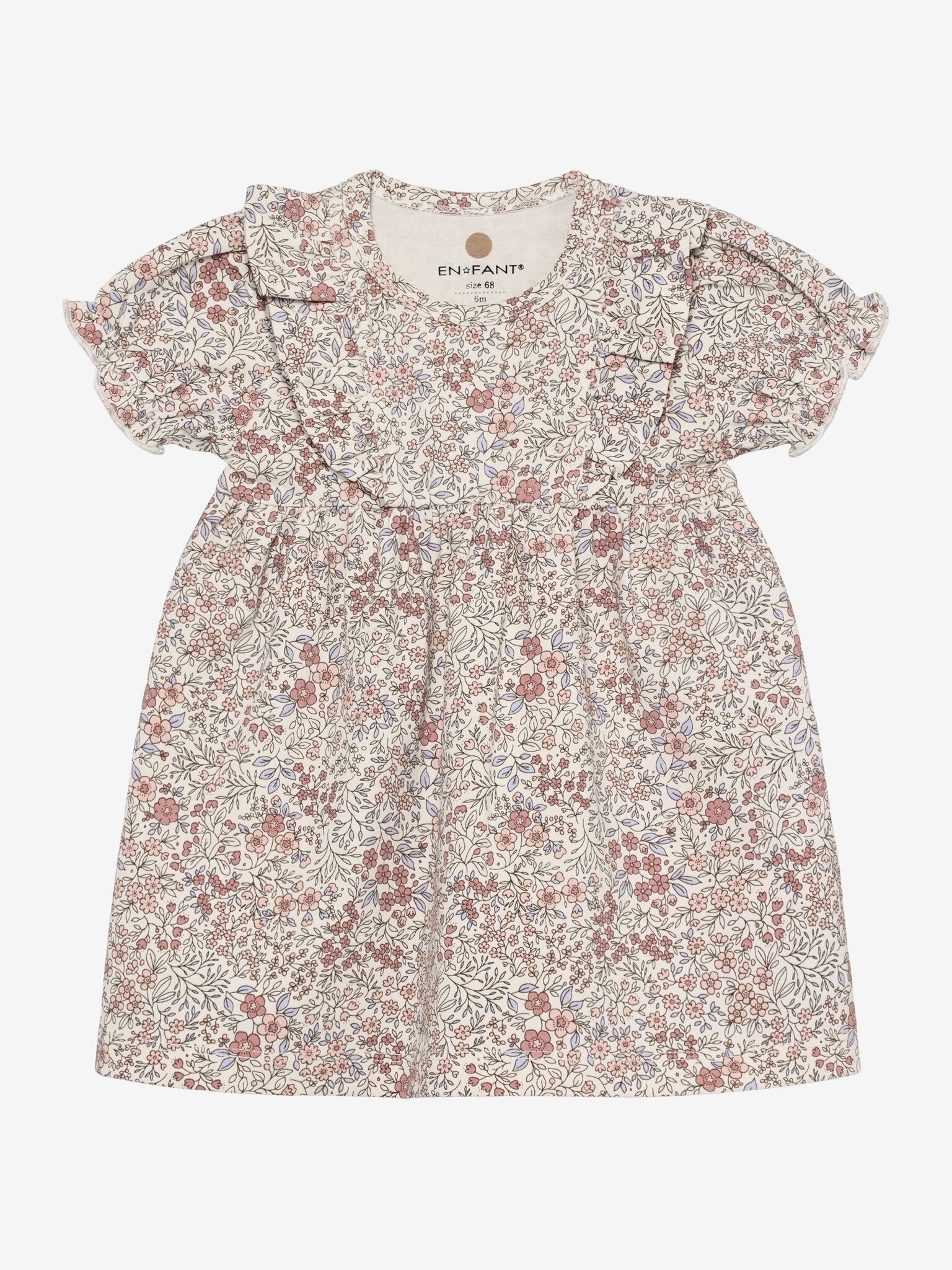 Kjole fra EN FANT. Denne kjolen er laget i en enkelt drakt med heltrykk. Kjolen har rynker ved skuldrene og et skjørt med rynker rundt livet. Den har flounce på brystet som går opp til skuldrene. Den kan åpnes ved skulderen