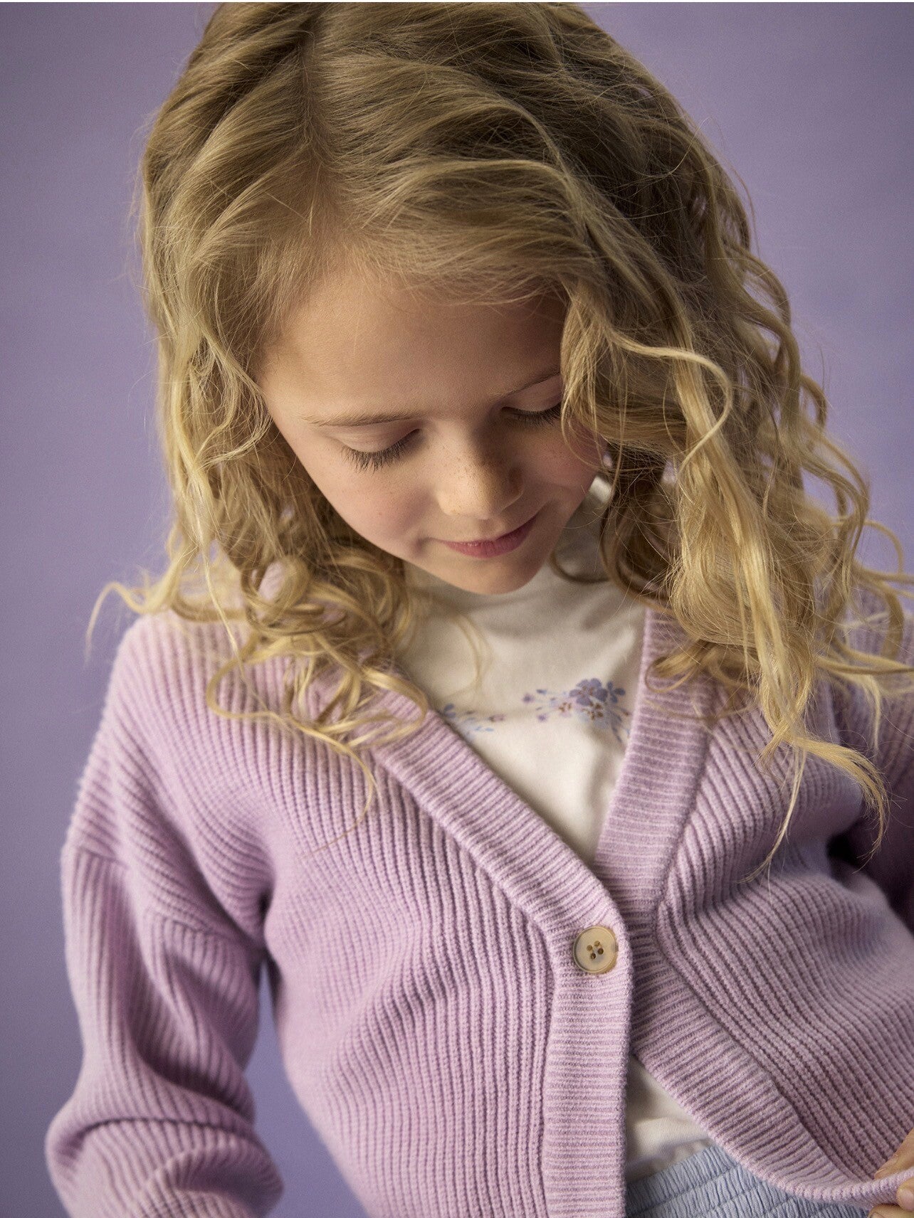 Kremet cardigan. Denne cardiganen er ensfarget, har V-hals og skulderløs passform