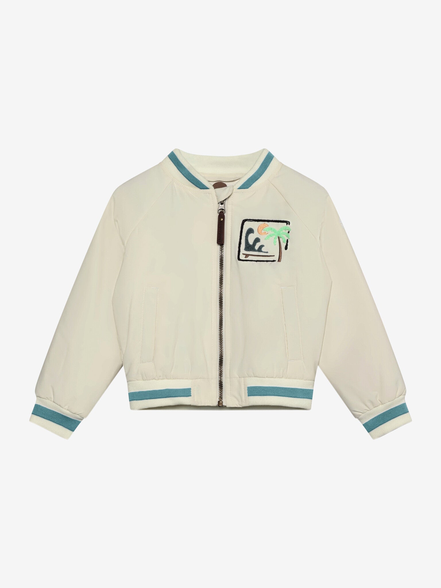 Fin bomberjakke fra EN FANT. Jakken har et stort brodert motiv på ryggen og et lite motiv foran på brystet. Jakken har brede ribbekanter på ermene og midjen. Jakken lukkes med glidelås med hakebeskytter og har lommer på sidene