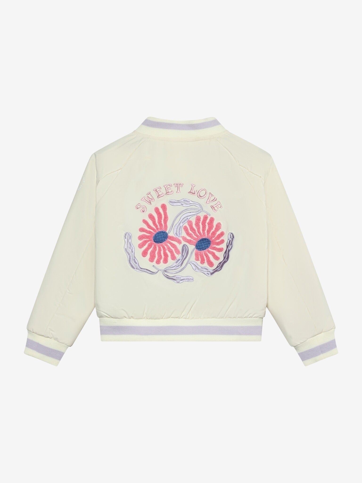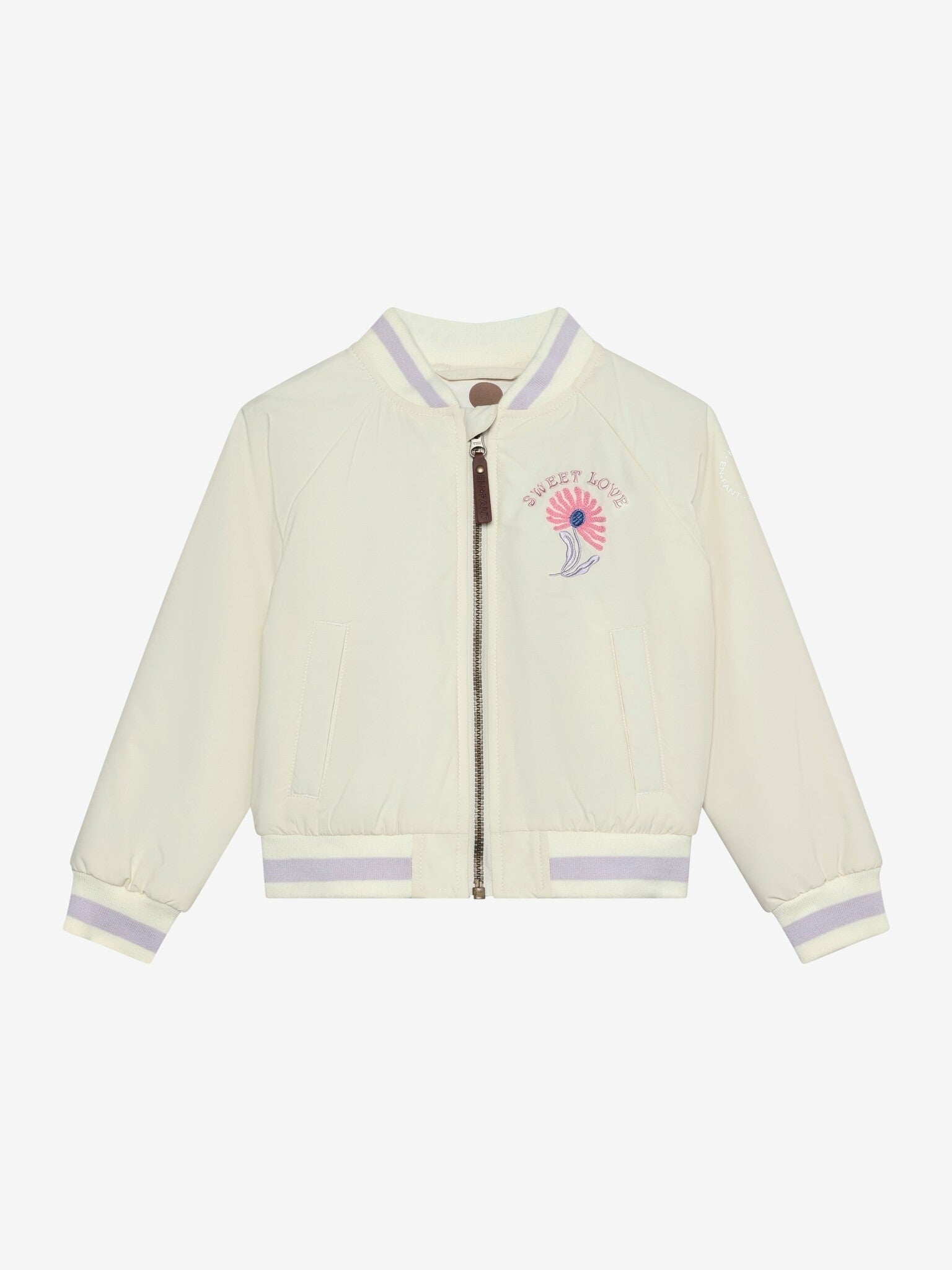 Fin bomberjakke fra EN FANT. Jakken har et stort brodert motiv på ryggen og et lite motiv foran på brystet. Jakken har brede ribbekanter på ermene og midjen. Jakken lukkes med glidelås med hakebeskytter og har lommer på sidene