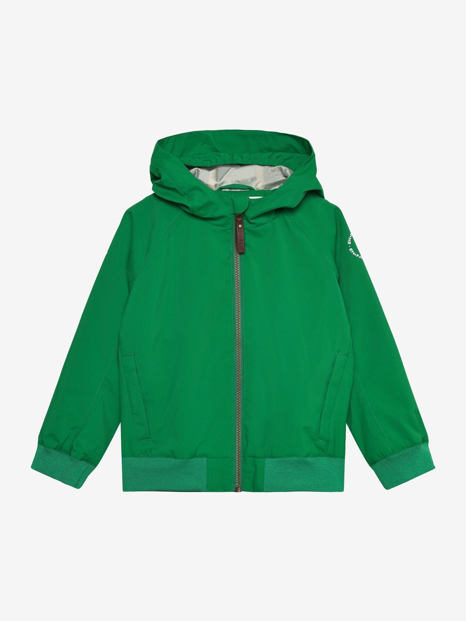 Kul bomberjakke med hette fra EN FANT. Jakken har brede ribbekanter på ermene og midjen. Jakken lukkes med glidelås med hakebeskytter og har lommer på sidene. Jakken er vindtett og vann- og skittavvisende, og har et testet vannkolonnetrykk på 10 000 mm, som kombinerer jakkens funksjonalitet og stil.