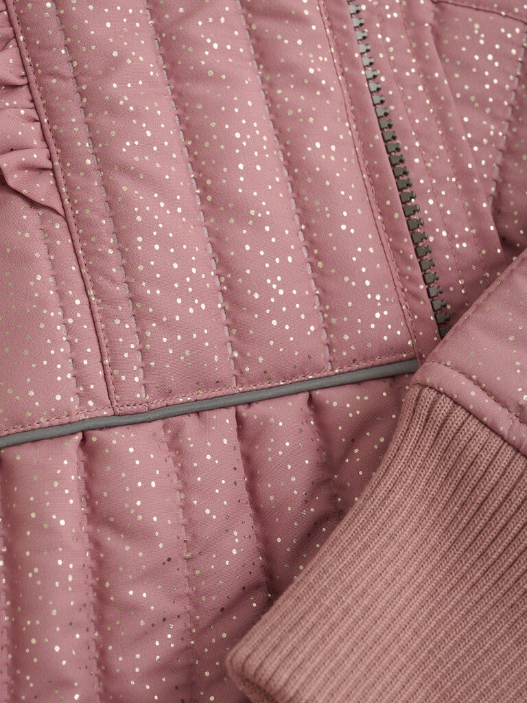 Termisk sett fra EN FANT med et pent glitterdesign. Settet består av en termojakke og termobukser i samme farge. Den termiske jakken åpnes med en kvalitetsglidelås foran. Jakken har volanger på skuldrene og nedover ermene foran og bak. Jakken har bred ribbestrikk på ermene med et praktisk hull for tommelen. Jakken har lommer på sidene og reflekterende detaljer på ryggen. Jakken er litt lengre bak enn foran. De termiske buksene har elastikk i midjen, som kan strammes med en elastisk snor på innsiden. Bred ribbelinje ved anklene.
