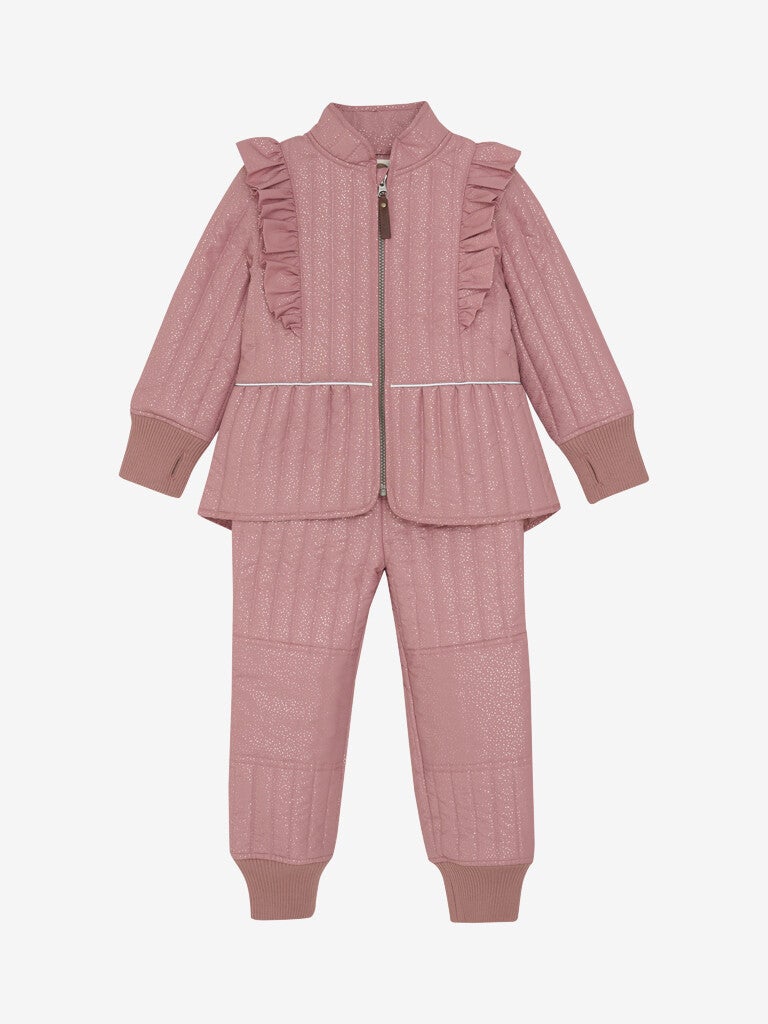 Termisk sett fra EN FANT med et pent glitterdesign. Settet består av en termojakke og termobukser i samme farge. Den termiske jakken åpnes med en kvalitetsglidelås foran. Jakken har volanger på skuldrene og nedover ermene foran og bak. Jakken har bred ribbestrikk på ermene med et praktisk hull for tommelen. Jakken har lommer på sidene og reflekterende detaljer på ryggen. Jakken er litt lengre bak enn foran. De termiske buksene har elastikk i midjen, som kan strammes med en elastisk snor på innsiden. Bred ribbelinje ved anklene.