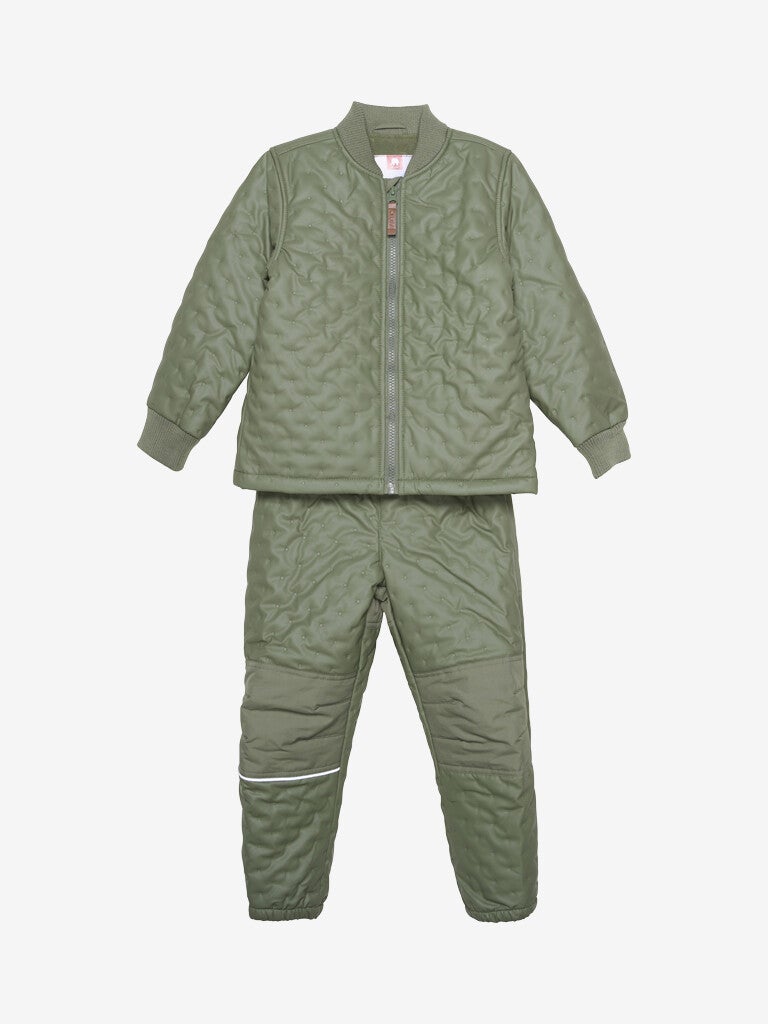 Pu-belagt termisk slitasje. Belegget gjør den termiske slitasjen vanntett. I tillegg har settet innvendig fôr. Ekstra forsterkning på knærne og baksiden av buksene. Buksene har også elastikk i livet og anklene. Den termiske jakken har ribber ved halsen og håndleddene.