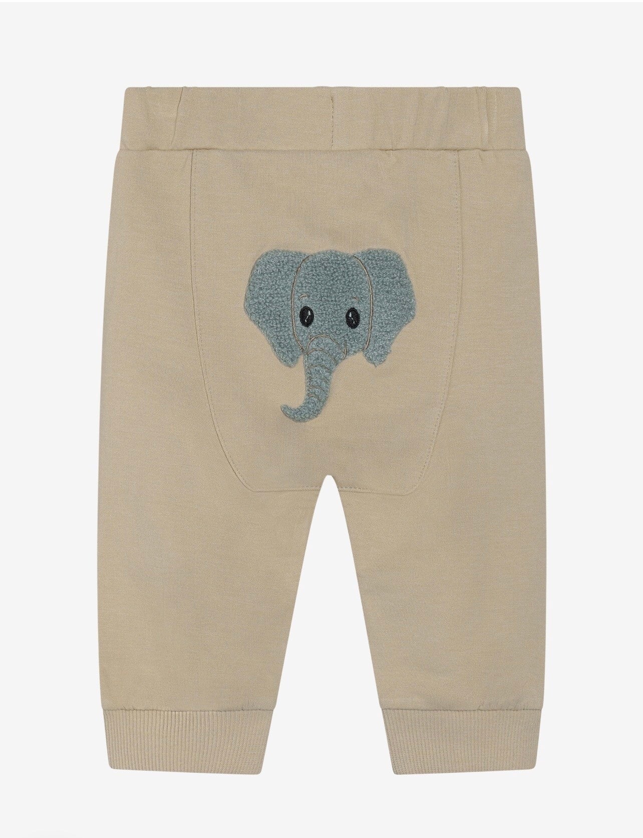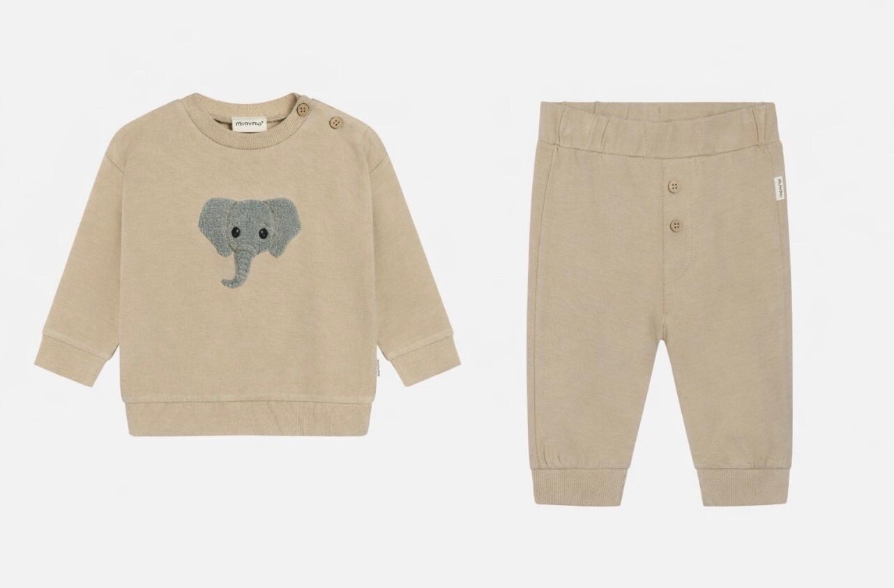 Joggebukse fra Minymo. Joggebuksen er ensfarget med trykk på ryggen. De er elastiske i midjen og anklene. Joggebuksen er fleksible og komfortable