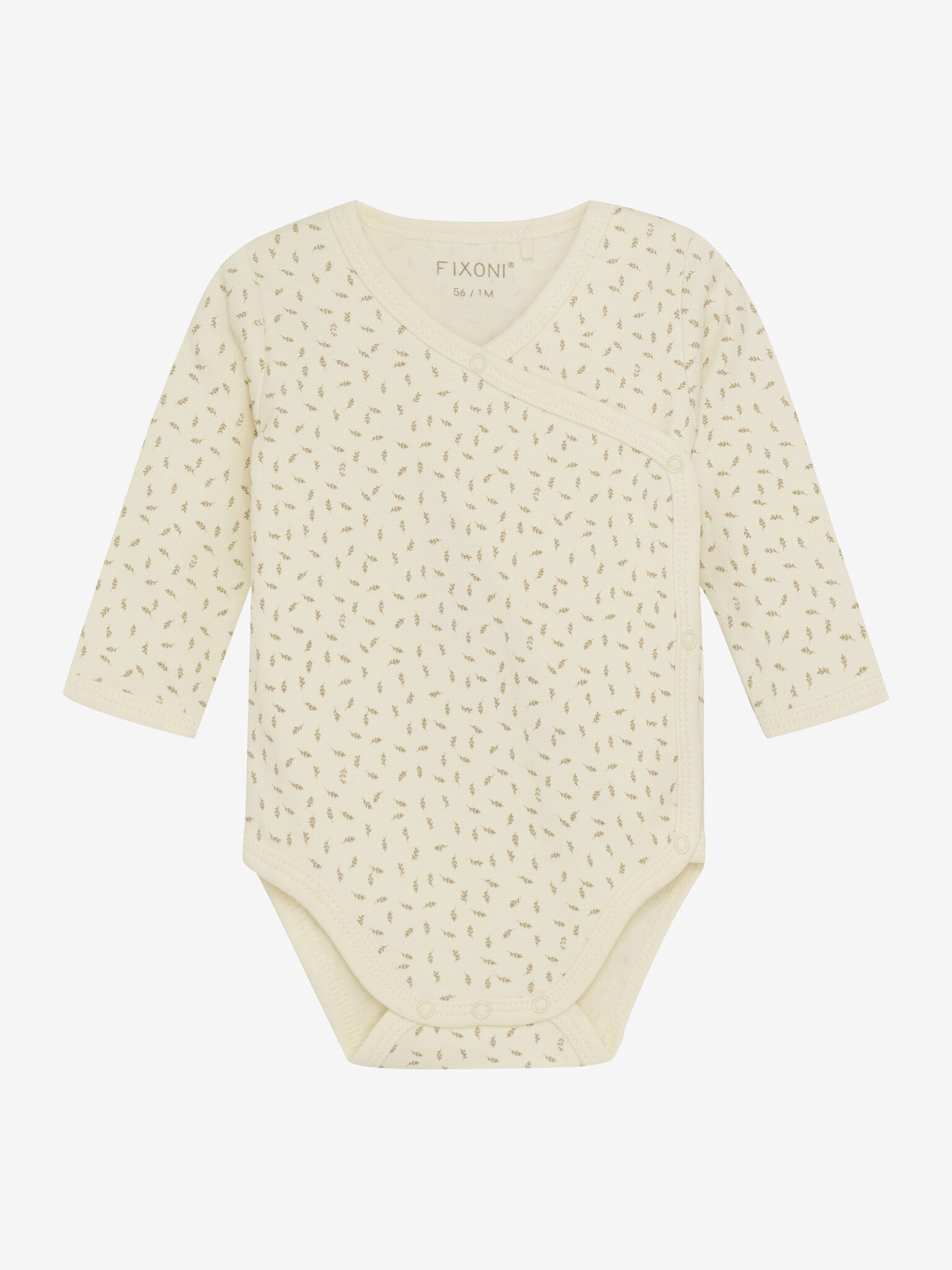 Omslagsbody med lange ermer og heldekkende mønster. Enkel å ta av og på, og godt egnet for babyer.