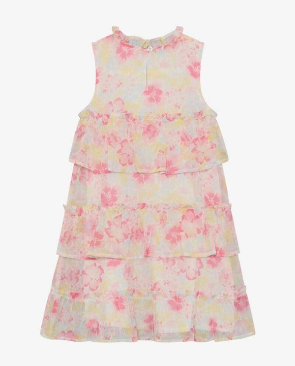 Ermeløs kjole fra Minymo med et fargerikt blomstertrykk. Kjolen er designet med flere lag med rysjer og en liten rysjekant ved halsutringningen. Lukkes bak i nakken med en knapp.