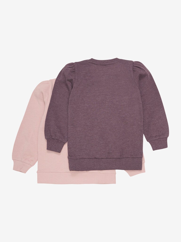 2-pakning med søte, ensfargede gensere. Disse genserne er laget av fransk frotté. De har ribbe ved halsutringningen, mansjettene og skjørten. Stor frontlomme. Puff-effekt ved ermer og mansjetter. Ensfarget