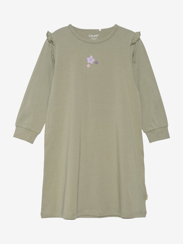 Behagelig nattkjole fra CeLaVi. Nattkjolen er laget av enkelt jersey og har trykk. Den har bredde nederst, volanger på skuldrene og ribbein ved nakken ved håndleddene.