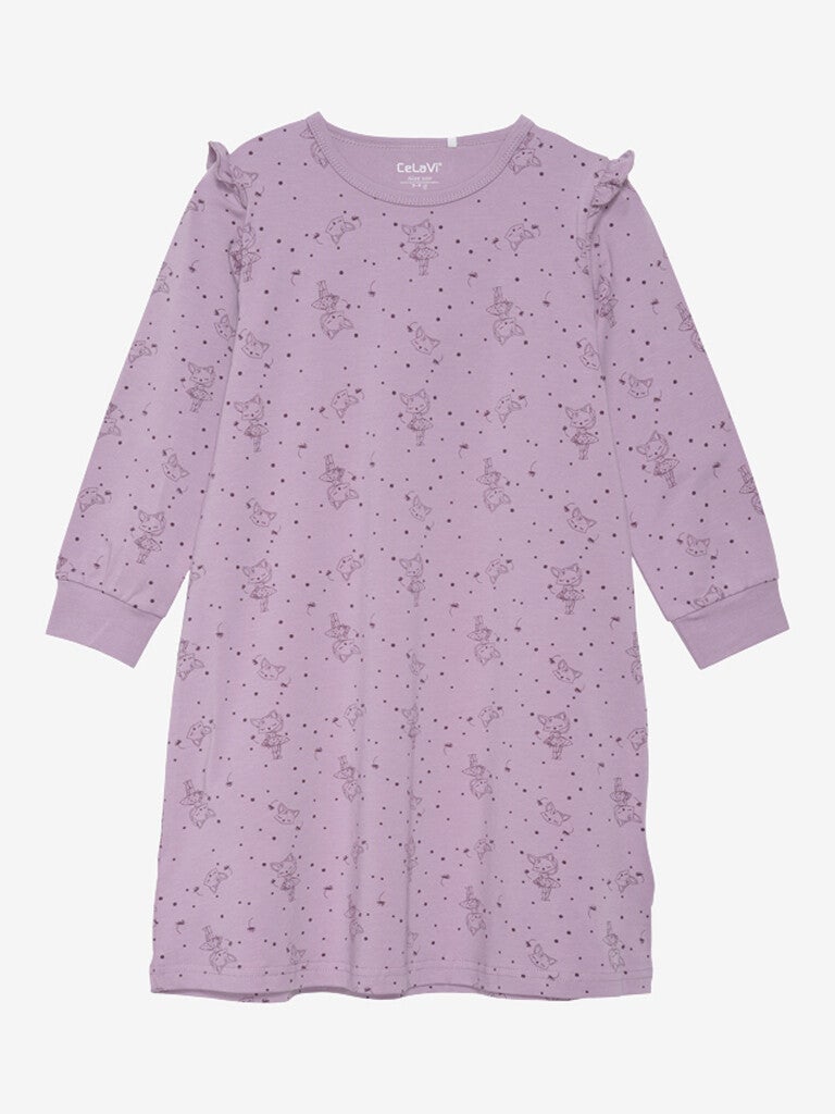 Behagelig nattkjole fra CeLaVi. Nattkjolen er laget av enkelt jersey og har trykk. Den har bredde nederst, volanger på skuldrene og ribbein ved nakken ved håndleddene.
