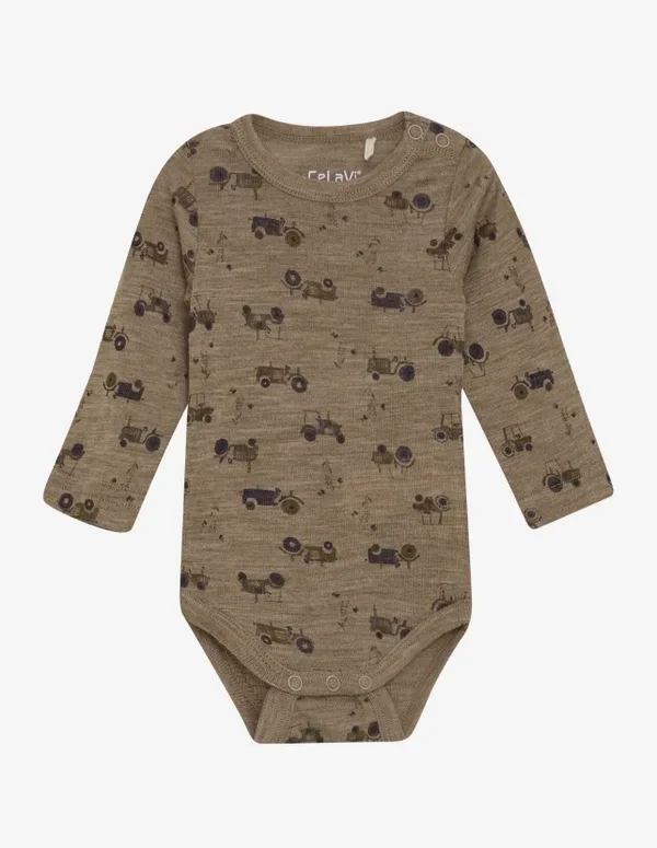 Langermet body fra CeLaVi med heldekkende traktortrykk, laget i 100 % merinoull. Bodyen åpnes med praktiske trykknapper på venstre skulder og mellom bena for enkel av- og påkledning. Supermyk og behagelig ullkvalitet som gir naturlig varme og komfort mot huden.