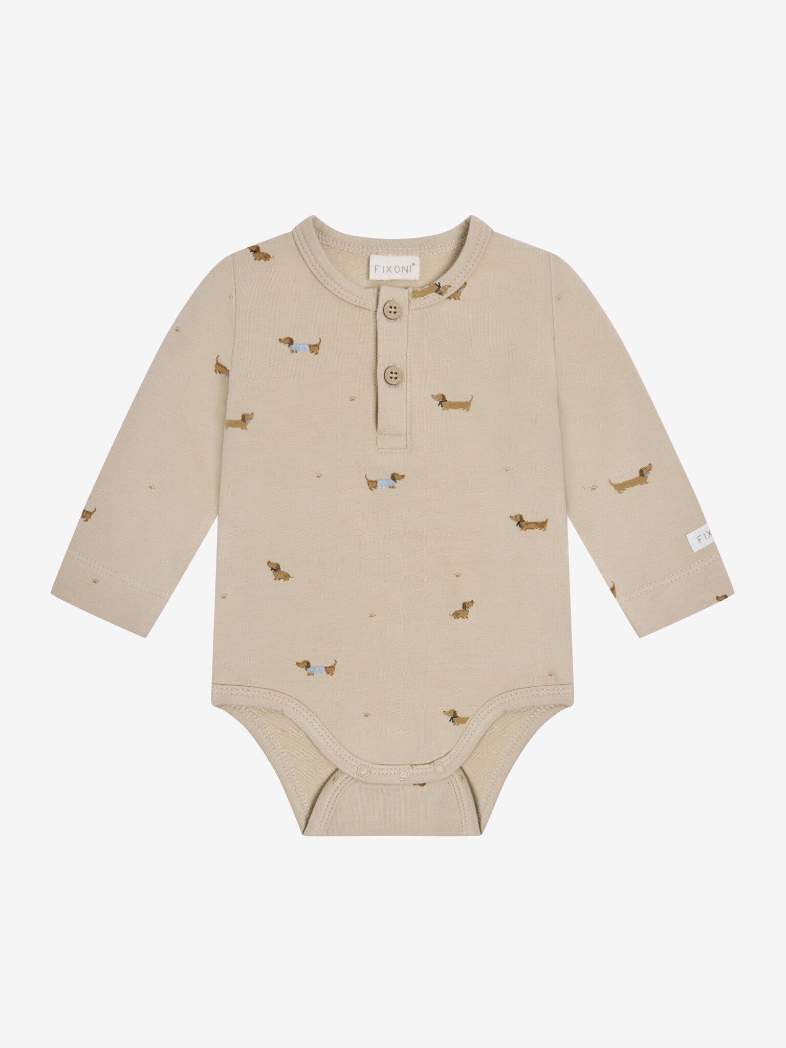 Langermet joggedress fra Fixoni. Body'n har rund hals og lukkes med knapper mellom bena.