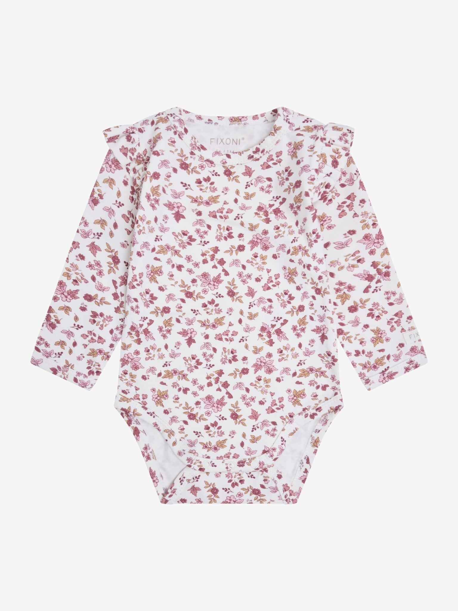 Langermet body med mønster fra Fixoni. Den har rund hals og lukkes med knapper mellom beina. Laget med sertifisert økologisk bomull.