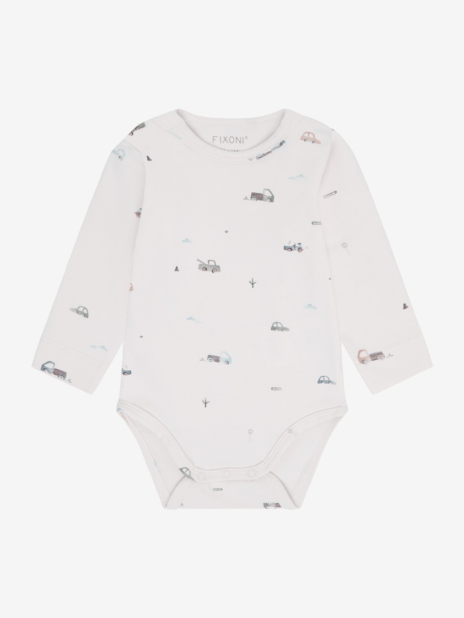 Langermet body med mønster fra Fixoni. Den har rund hals og lukkes med knapper mellom beina. Laget med sertifisert økologisk bomull.