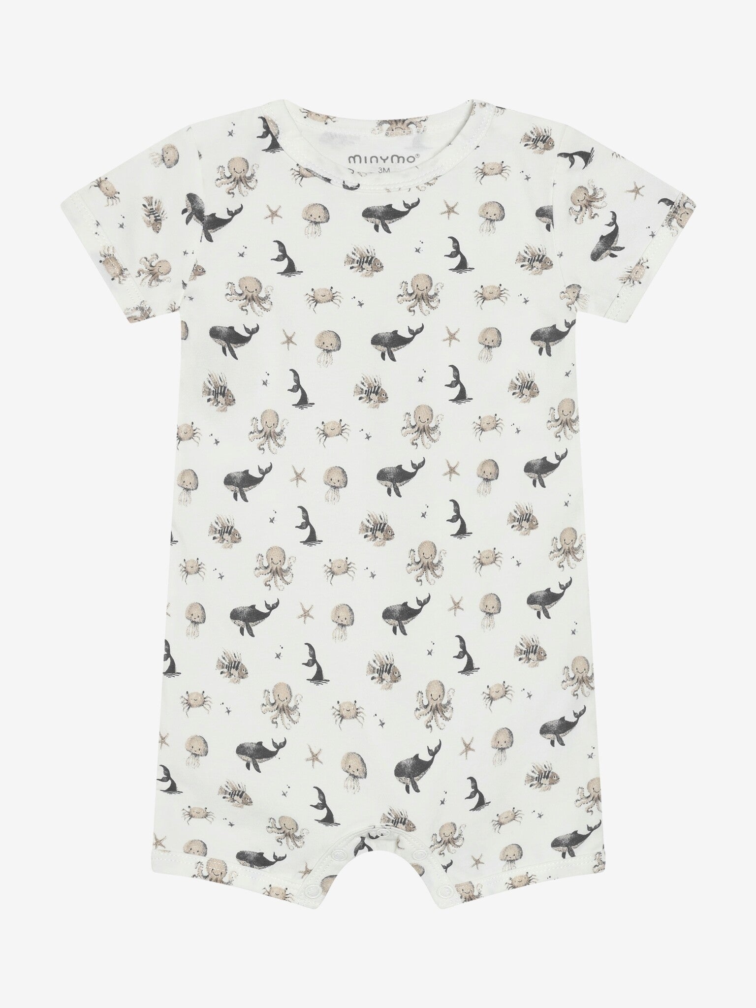 Dress fra Minymo. Dressen har korte ben og ermer og lukkes med trykknapper mellom bena. Den har også et heldekkende trykk. Laget med sertifisert økologisk bomull